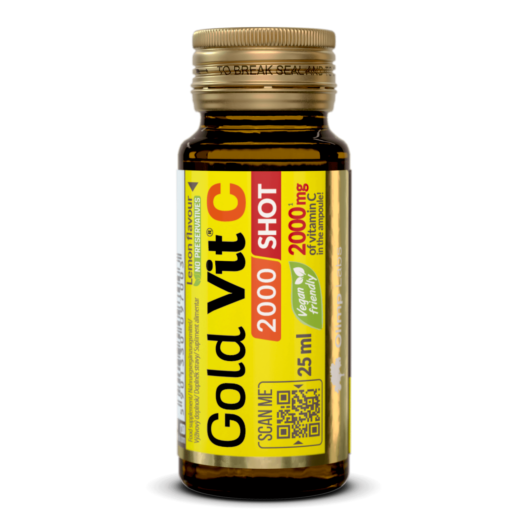 Gold-Vit C 2000 shot is a liquid dietary supplement in ampoules, with a high content of vitamin C — as much as 2000 mg in a single ampoule. Vitamin C comes from the PureWay-C® fatty metabolites. PureWay-C® has an excellent absorption rate in the body. Gold-Vit C 2000 shot contains sugar and sweeteners. Lemon flavour.