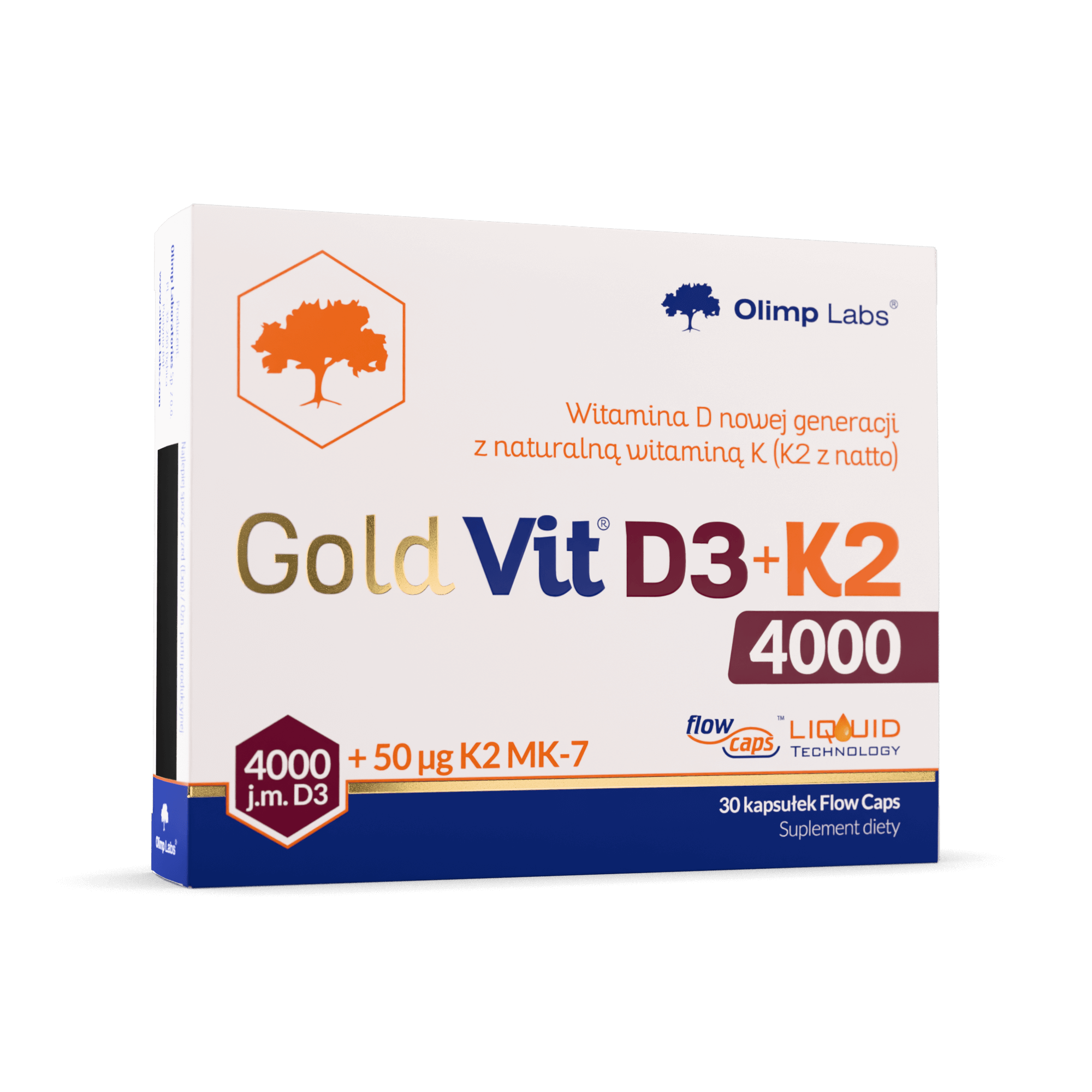 Suplement diety w postaci kapsułek płynnych Flow Caps, zawierający wysoką porcję witaminy D (D3) w ilości aż 4000 j.m. Produkt uzupełniono o naturalną witaminę K z natto, występującą w najbardziej przyswajalnej i najaktywniejszej formie1 – menachinonu-7 (witamina K2). Produkt zawiera olej lniany o wysokiej zawartości kwasów tłuszczowych omega-3, do których należy kwas alfa-linolenowy (ALA).