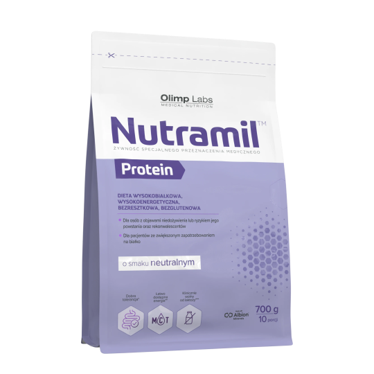 Preparat stanowi kompozycje niezbędnych składników pokarmowych – białek, węglowodanów, tłuszczów, witamin, mikro- i makroelementów (w tym minerałów w postaci wysoko przyswajalnych chelatów aminokwasowych Albion™). Stanowi uzupełnienie codziennej diety. Zawiera trzy źródła wysokowartościowego białka o zróżnicowanej kinetyce wchłaniania – koncentrat białka serwatki, kazeinian wapnia oraz izolat białka serwatki. Źródłem węglowodanów w produkcie są maltodekstryny, które podobnie jak białko wykazują zróżnicowaną szybkość absorpcji. Źródłem tłuszczów są oleje roślinne dostarczające długołańcuchowych triglicerydów (LCT) i niezbędnych kwasów tłuszczowych oraz triglicerydów o średniej długości łańcucha (MCT), stanowiących łatwo dostępne źródło energii dla osób, dla których jest to istotne, tj. niedożywionych czy wyniszczonych. Do trawienia triglicerydów o średniej długości łańcucha (MCT) nie jest konieczna lipaza i żółć, co ma istotne znaczenie m.in. u osób z funkcjonalnymi zaburzeniami trzustki, przebiegającymi z upośledzeniem wchłaniania tłuszczów. Produkt bezglutenowy, bezresztkowy. Klinicznie wolny od laktozy***. Wśród osób, którym lekarz zaleci stosowanie produktu, mogą znajdować się osoby wykazujące nietolerancje laktozy. W takich przypadkach znaczna zawartość laktozy w produkcie mogłaby uniemożliwić lub ograniczyć jego stosowanie, co byłoby sprzeczne ze wskazaniami lekarza. Z tego względu Nutramil Protein jest klinicznie wolny od laktozy, tj. jej ilość nie przekracza 0,02 g/ 100 kcal w całodziennej diecie, co jest zgodne z opinia Panelu Naukowego EFSA ds. żywności dietetycznej, żywienia i alergii (EFSA Journal 2010;8(9):1777).